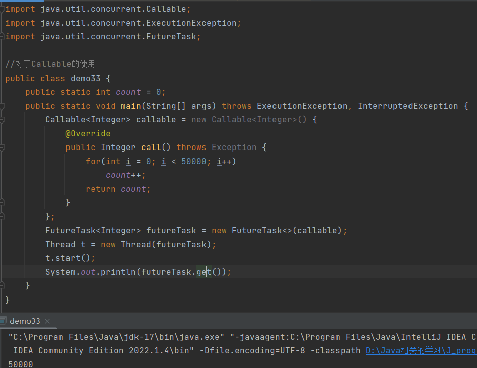 Callable的使用:首先要重写call方法,再通过FutureTask来接受Callable这个参数,最后将FutureTask作为Thread的参数进行传递,最后通过get方法进行获取