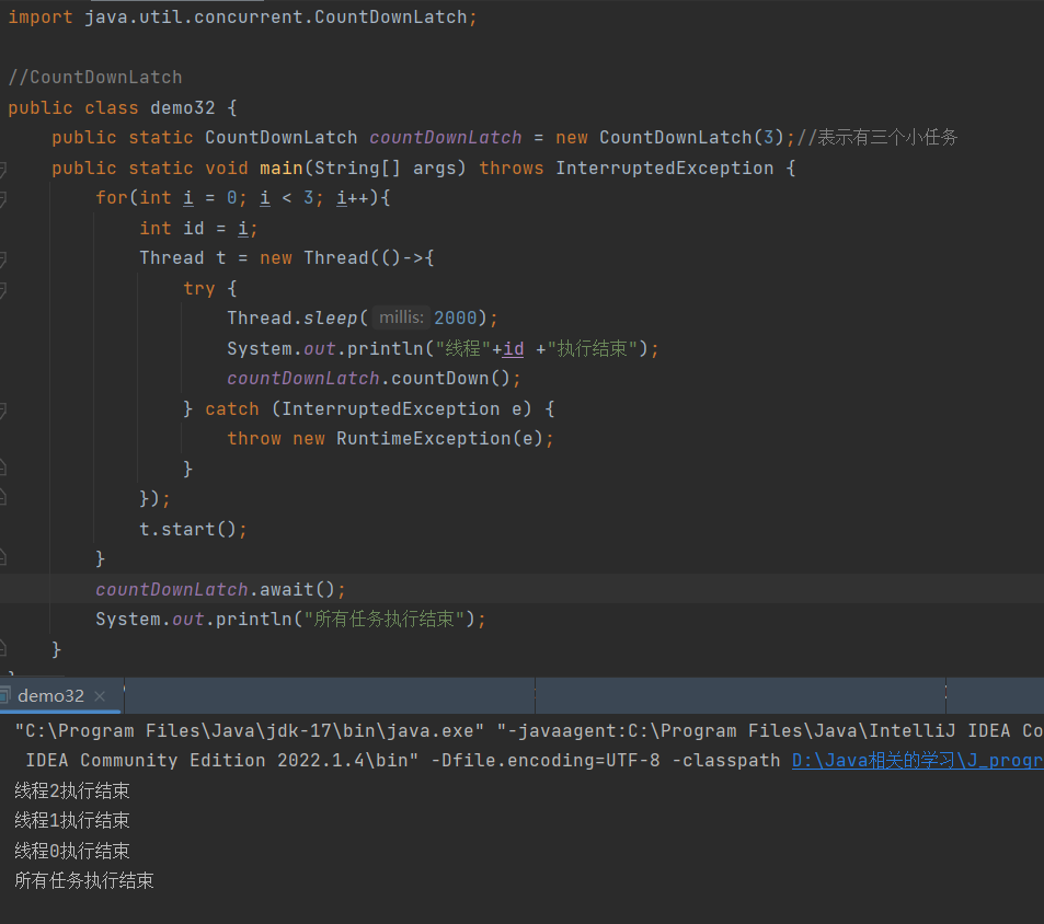 CountDownLatch用来表示将一个大的任务分成多个小的任务,统计这个大任务完成的结束时间,