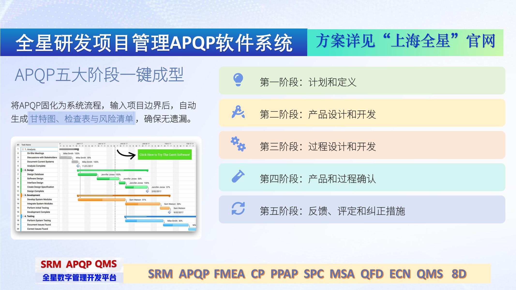 **《全星研发项目管理APQP软件系统》**则构建了全流程体系化管控机制: