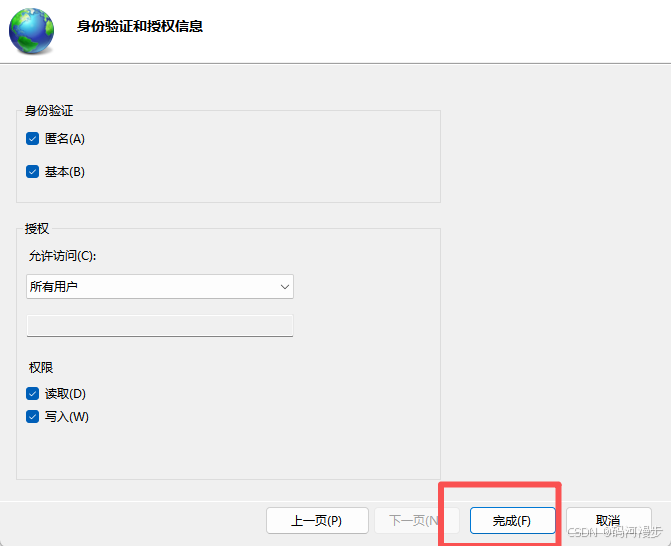 7、勾选上匿名和基本,允许访问这里下拉选择所有用户,权限选择读取和写入,点击完成。