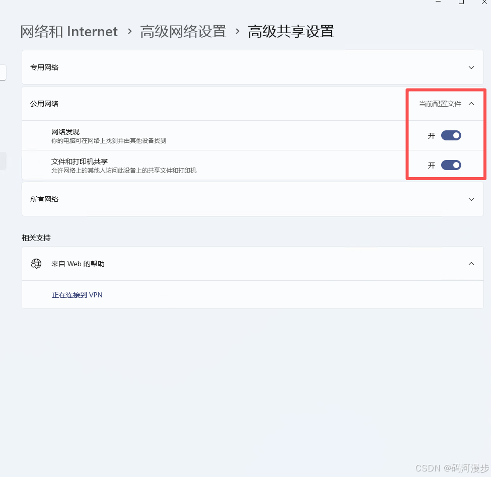 8、当前配置文件中,这里的网络发现和文件和打印机共享要打开,不然访问不到