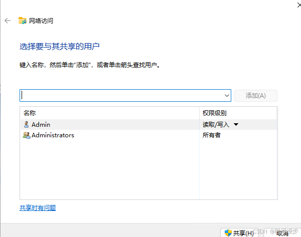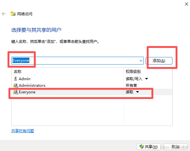 3、下拉选择用户,然后一定要点击右边的添加,然后下边会出现你选择的用户,我们这里选择Everyone