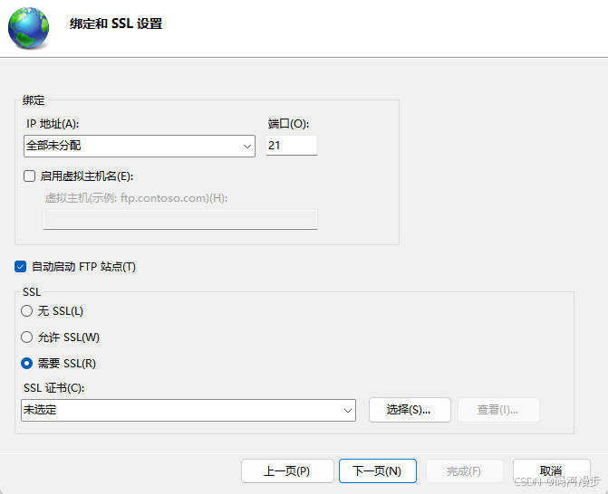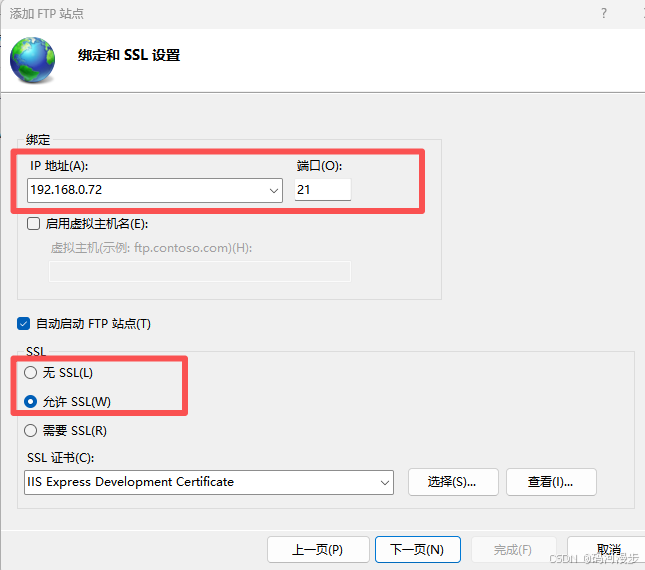 6、下拉选择本机的ip地址,SSL选择允许SSL,然后下拉选择SSL的证书,点击下一页