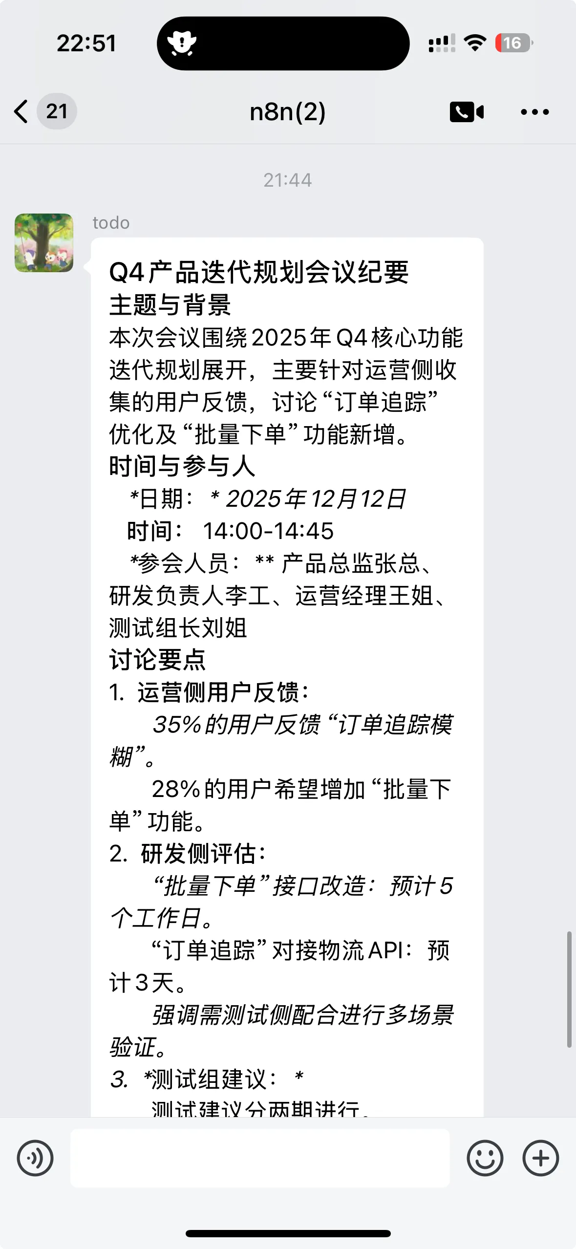 朋友们,有没有感觉整理纪要格式很乱,发到企微群里还得截图,别人看着也费劲。今天教你------用n8n工作流,把AI生成的Markdown格式会议纪要,原汁原味直接发到企业微信!
