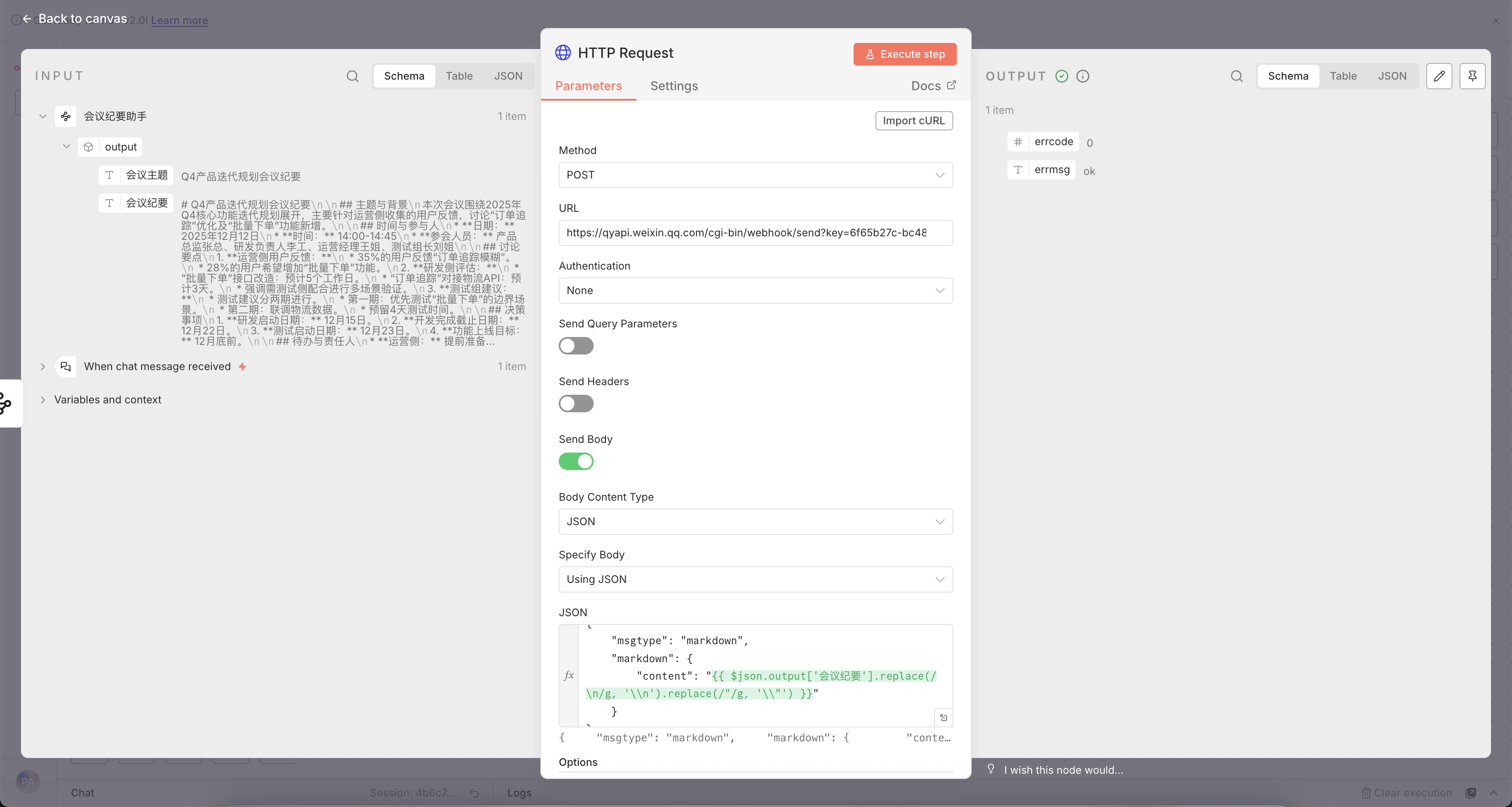 "content": "{{ $json.output['会议纪要'].replace(/\\n/g, '\\\\n').replace(/\"/g, '\\\\\"') }}"
