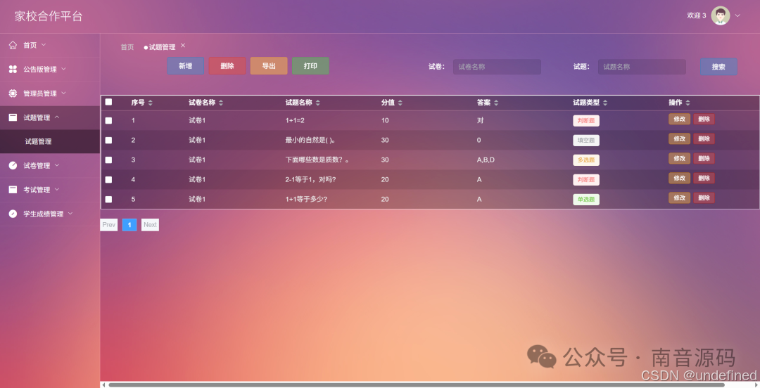 试题管理:管理试题信息,包括新增、查看、修改、删除、打印和导出试题。