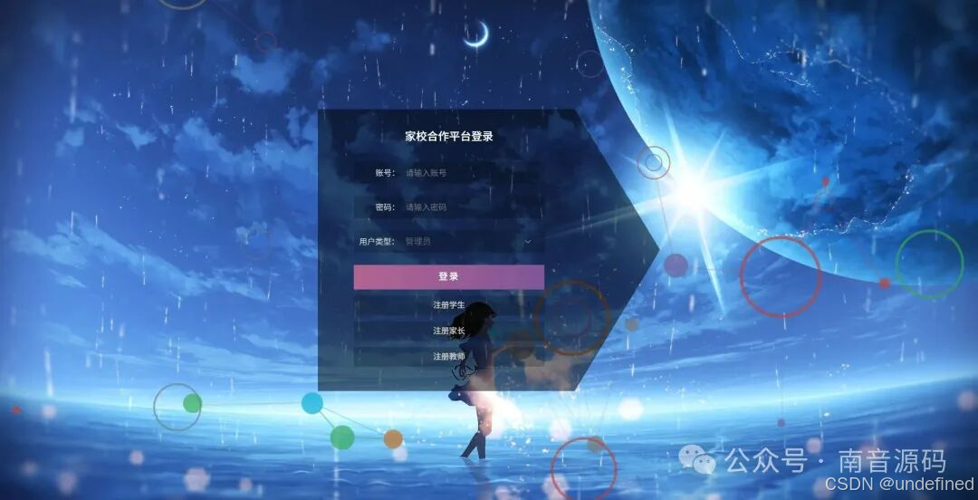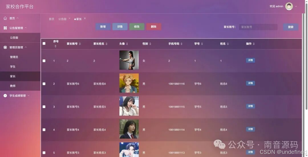 管理员管理:管理管理员、学生、家长和教师的信息。