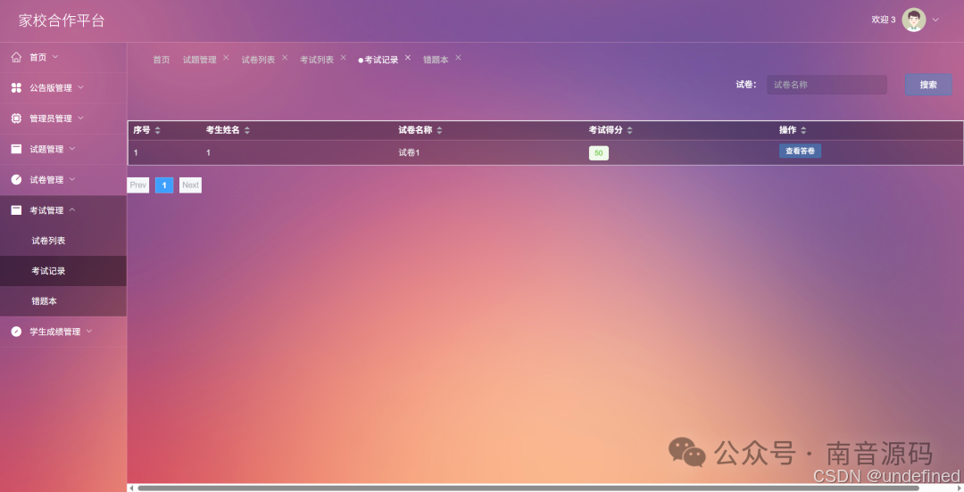 考试管理:查看试卷列表、考试记录和错题本,并批阅考试记录。