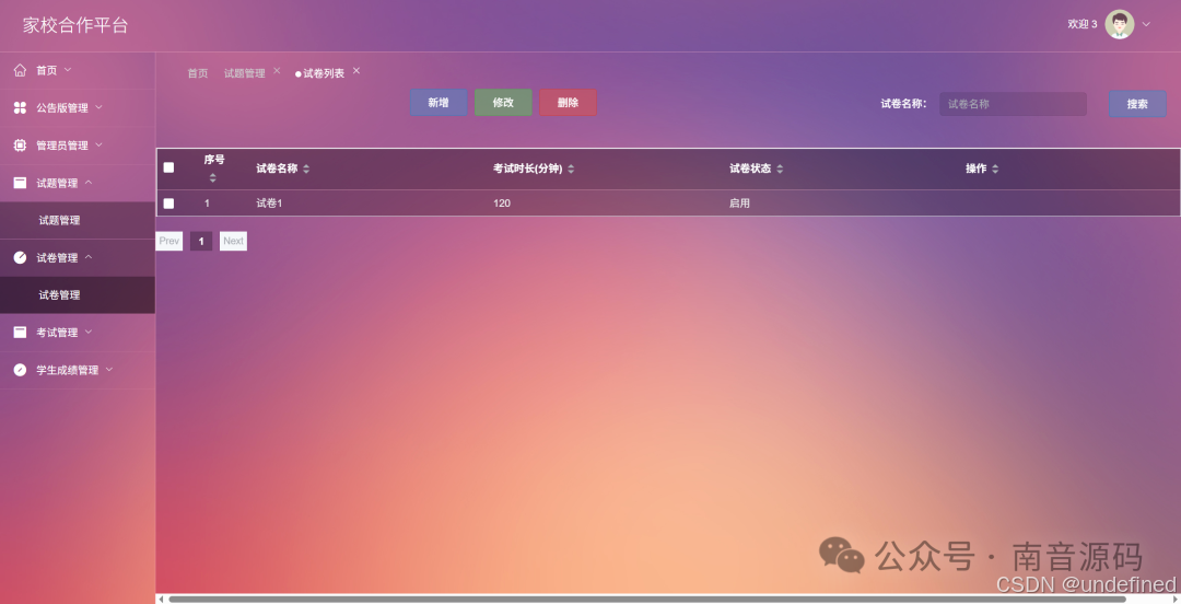 试卷管理:管理试卷信息,包括查看、组卷、删除、修改和新增试卷。