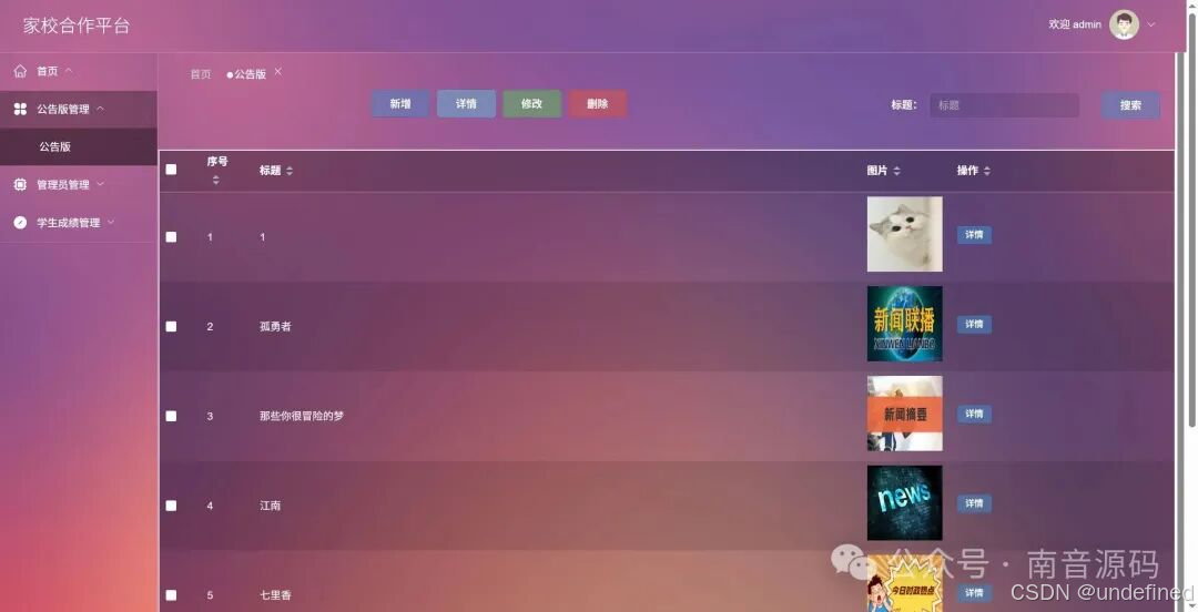 公告版管理:管理公告版信息,包括新增、查看、修改和删除公告。