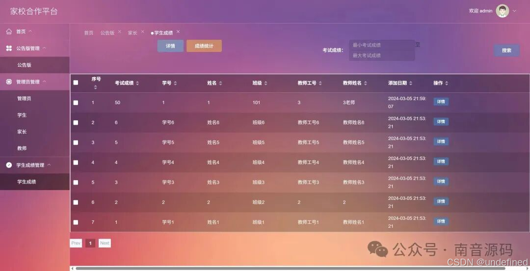 学生成绩管理:管理学生成绩,包括查看、新增、修改、删除、成绩统计、首页总数和首页统计。