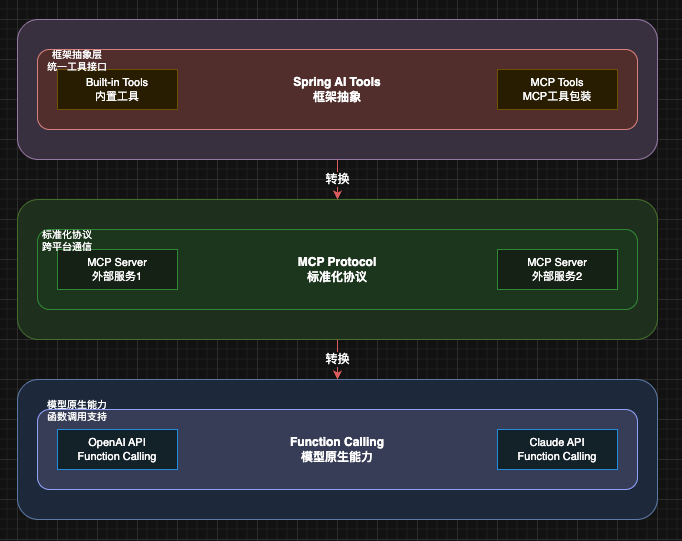 - Tools (Spring AI) 是应用框架层的抽象,提供统一的工具接口和管理机制