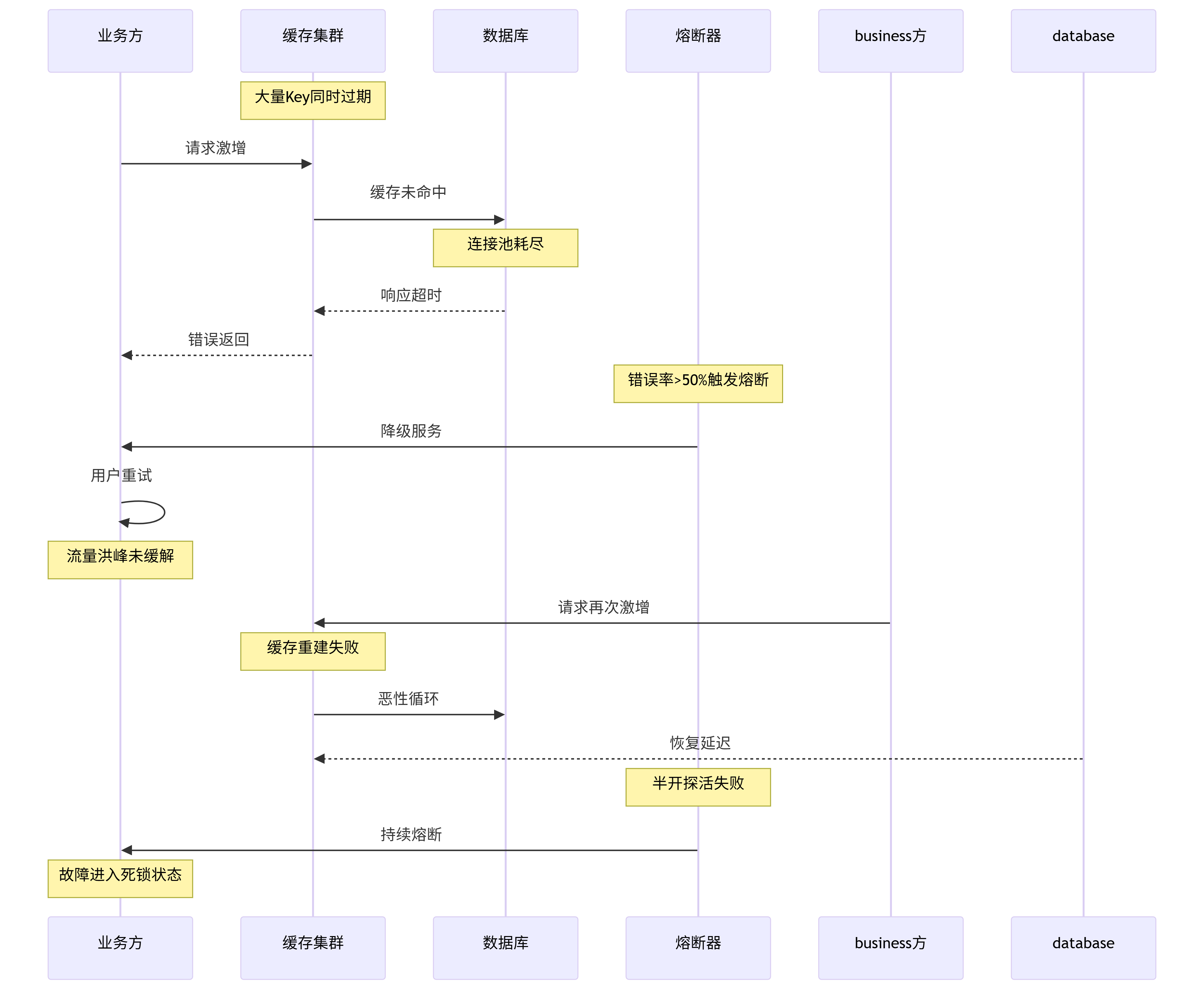 - 环形演化:缓存命中率下降 → 数据库压力上升 → 慢查询增多 → 线程池阻塞 → 接口超时 → 用户重试 → 流量洪峰 → 缓存进一步失效