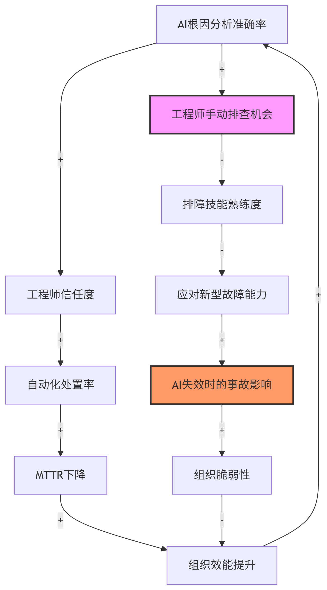 阿里高级技术专家在QCon 2023分享中警示: "AIOps越精准,初级工程师的排障能力退化越快" 。这是一个典型的成长上限结构: