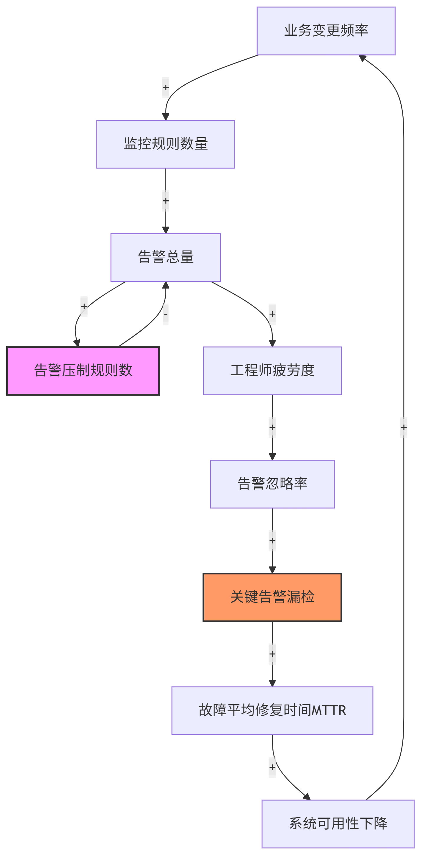 监控规则↑ → 告警总量↑ → 压制规则↑ → 告警总量↓看似有效,实则掩盖了真实问题 - 调节回路B1 :