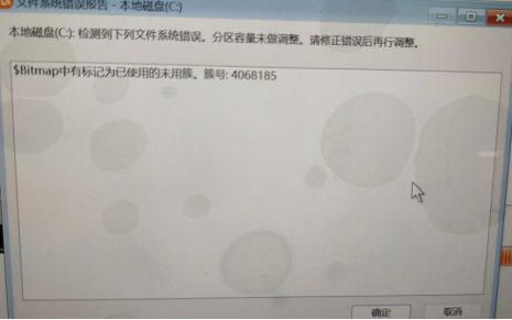 出现 "Bitmap 中有标记已使用的未用簇(簇号:4068185)"** 说明你的分区 **NTFS 文件系统的位图(Bitmap)记录的簇使用情况和实际文件系统结构不一致。简单讲: