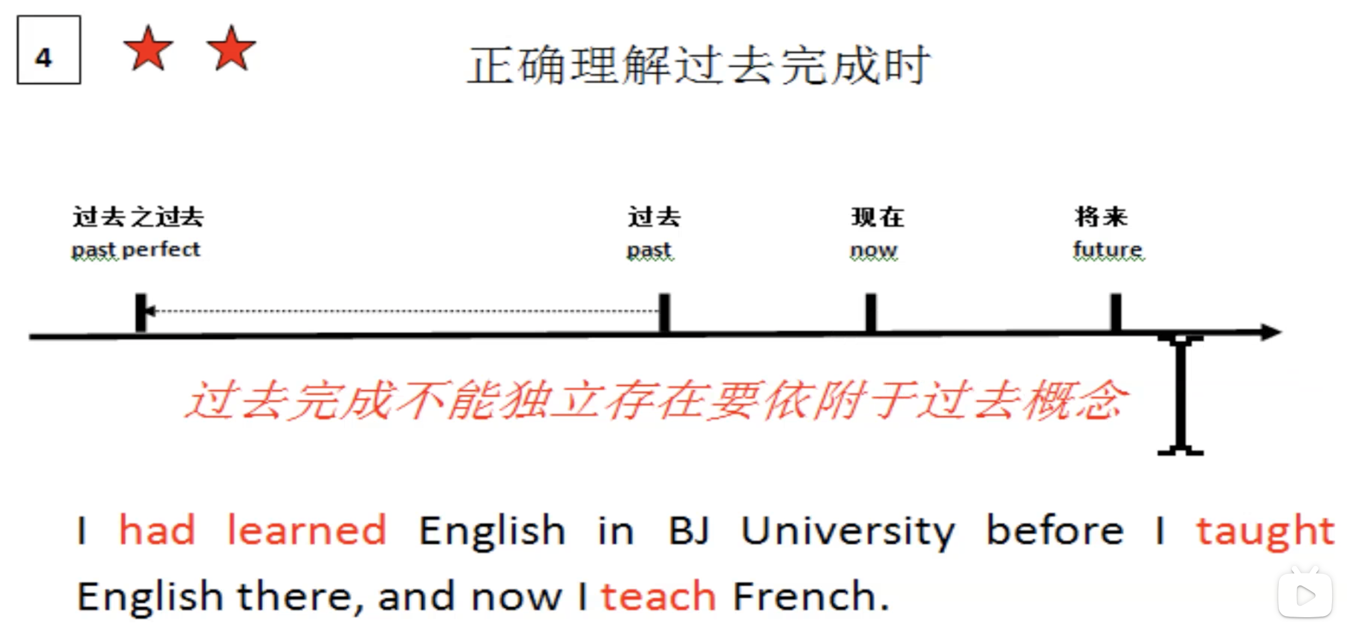 过去完成时不能独立存在,它要依附于过去概念。过去将来时是 "过去的过去",如果没有过去,那就不能有更远的过去。即:在没有出现一般过去时对比的情况下,是不能独立出现过去完成时的。