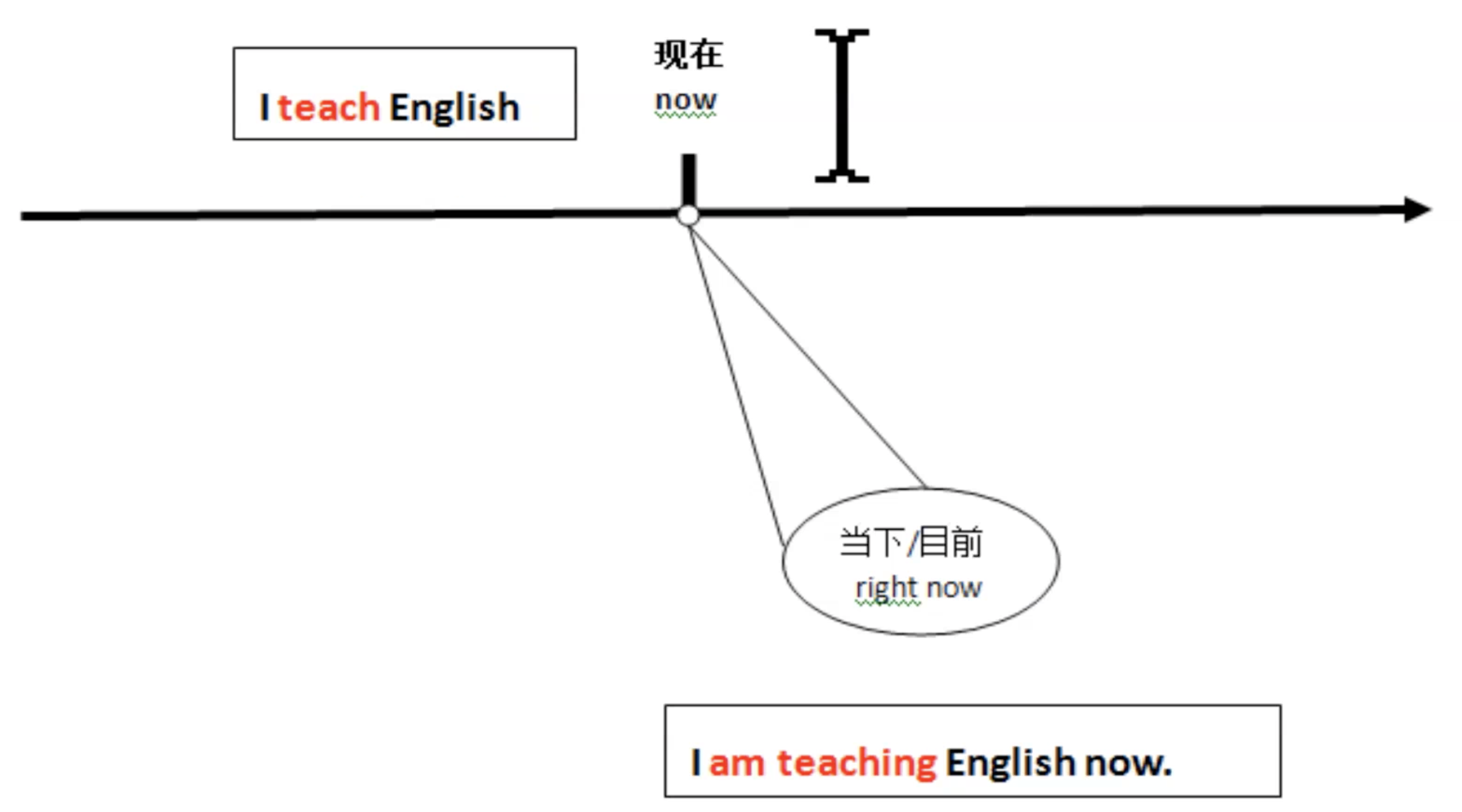 现在进行时:把现在这个时间点展开、放大,让它更加的现在,这就是现在进行时了。