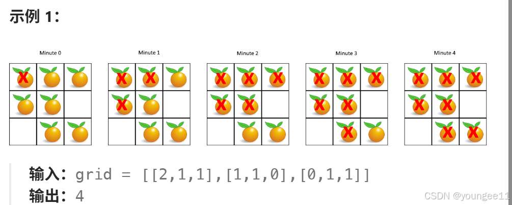 返回 直到单元格中没有新鲜橘子为止所必须经过的最小分钟数。如果不可能,返回 -1。