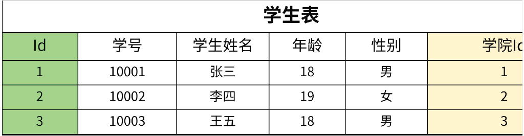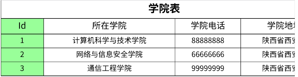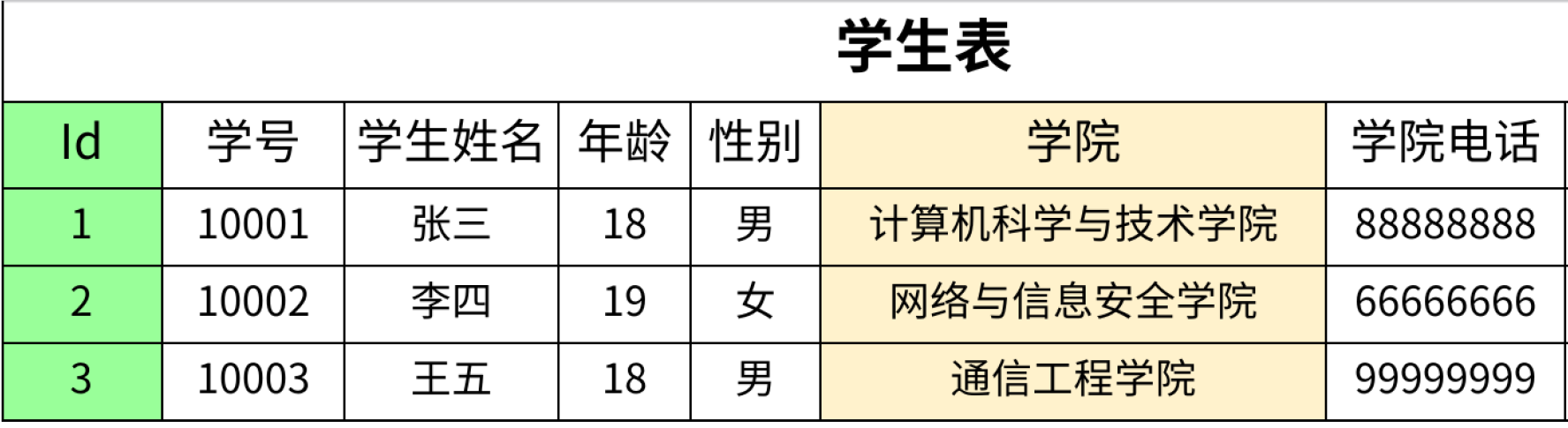 - 在这个表结构中,可以看出学生的学号、姓名、年龄、性别和主键ID强相关;学院的电话和学院也是强相关;在一个表中出现了两个强相关的关系,而且这两个强相关关系又存在传递现象------通过学生ID可以找到学生记录,学生记录中包含学院名,每个学院又有自己的电话和地址。