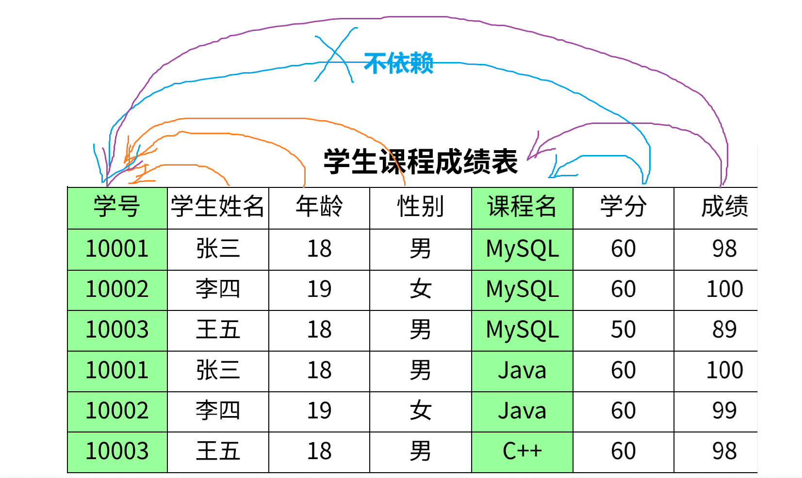 - 学生是通过学号 来确定的,学生的年龄、性别和课程没有关系,只依赖学号,不依赖课程名;学分是通过课程 确定的,课程的学生和学生没有关系,学分只依赖课程名,不依赖学生;乘积同时依赖学号+课程名