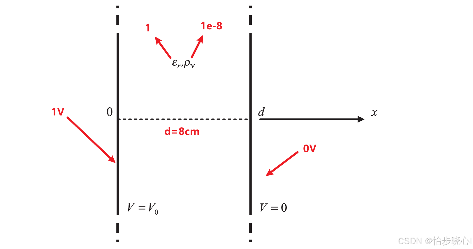 V ( 0 ) = 1 V , V ( d ) = 0 V V(0) = 1 \,\text{V}, \qquad V(d) = 0 \,\text{V} V(0)=1V,V(d)=0V
