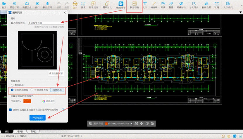 3.启用【图形识别】功能,框选手动报警按钮图例后右键调出对话框,输入图形名称并将搜索范围限定于一层火灾报警平面图,即可启动智能识别。