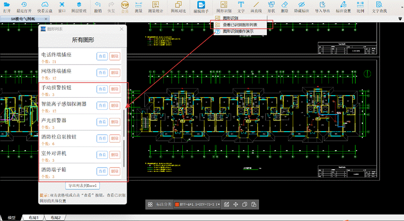 待所有消防器具识别完毕,通过【查看已识别图形列表】功能精准统计工程量:室外对讲机3台、消防端子箱3台、智能离子感烟探测器12个、手动报警按钮3个、消火栓启泵按钮6个。