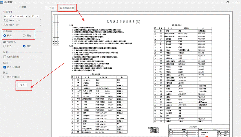 2.鉴于消防器具数量众多,频繁切换图纸效率较低,可运用**CAD快速看图**的【导出PDF】功能导出高清图纸。导出时需特别注意框选范围、页面方向与页面尺寸的设定。