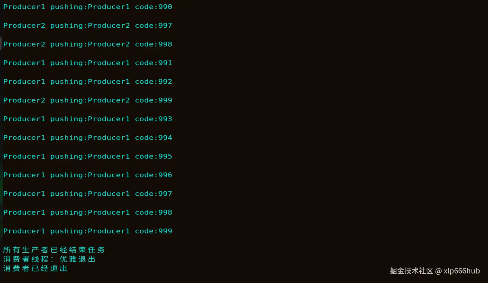 由于我在两个生产者中都添加了printf函数,所以在终端会看到他们打印出来的内容,总共2000条,我只截图了最前面和最后面的部分,可以看到已经实现了优雅退出(生产者全部退出后,消费者自动退出)。