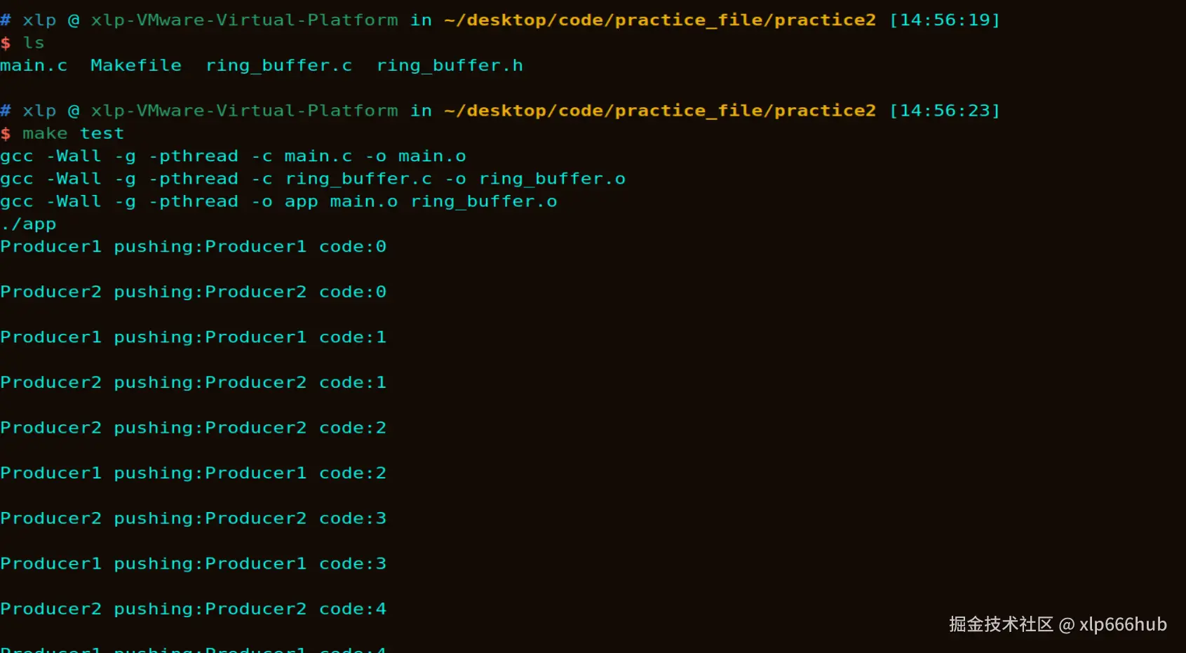 结果分析:在容量仅为 10 的情况下,2000 条日志全部落盘,证明条件变量的 wait & signal 逻辑 很严密。主线程成功等待所有子线程结束,证明优雅退出 机制生效,没有线程卡在 wait 状态。从终端输出可以看到,两个生产者交替抢占 时间片,证明互斥锁有效保护了临界区。