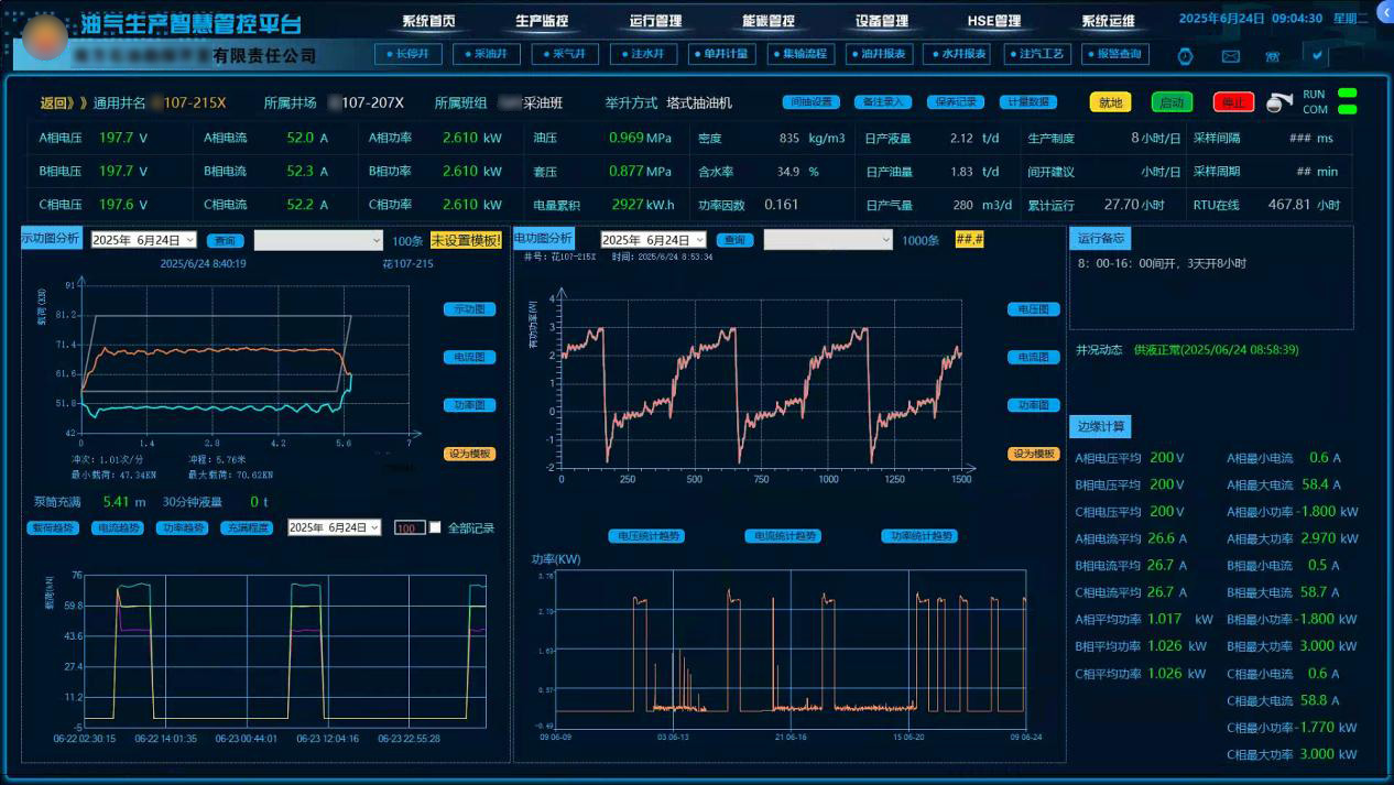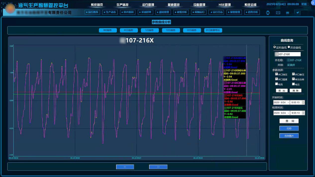 系统支持任意组合生产参数(如产液量、载荷、电流等)生成趋势曲线,支持按时间区间查询与对比分析。例如,通过采气井的油压趋势变化,可诊断柱塞井间开制度的合理性;通过采油井冲次调整前后的有功功率变化曲线,评估参数调整对能耗的影响。同时,系统基于示功图开发电功图应用,通过边缘计算统计电压、电流不平衡等特征,精准定位故障井。