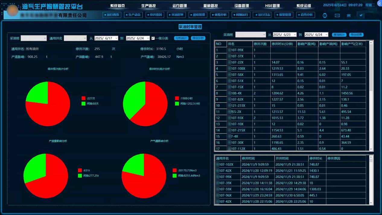 依托系统采集的实时生产数据与管理行为数据,开展深度关联分析。例如,通过停井原因大数据分析,量化各因素对采油时率的影响,精准定位管理短板;通过 41 口井的间抽制度智能优化建议及效果验证,实现节能降耗与设备寿命延长。系统将生产过程数据,为管理层决策提供数据支撑,推动生产管理方式向数据驱动转型。