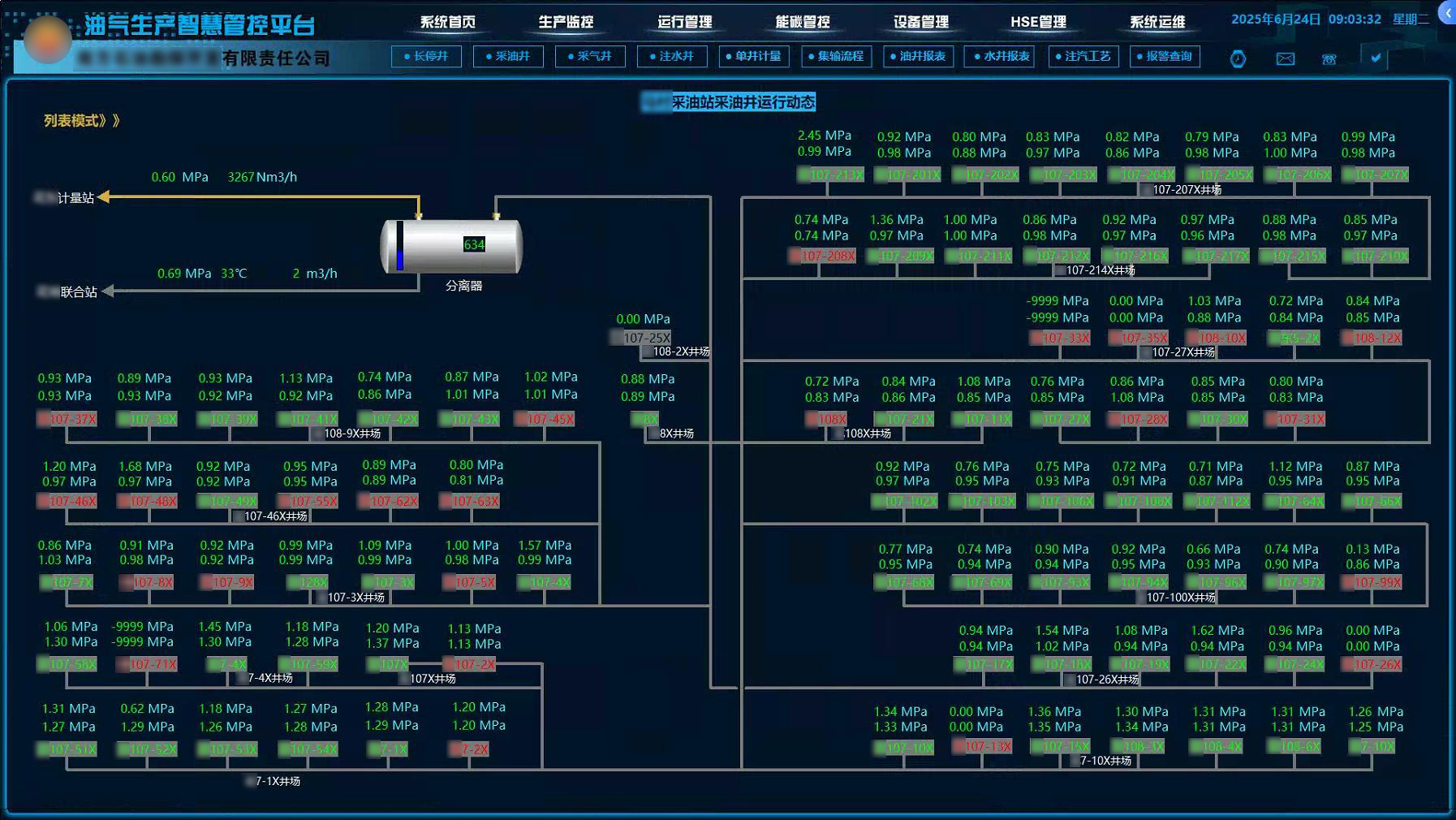 系统实现示范区油、气、水井生产数据的全覆盖采集,通过将分散的井场数据汇集至中心监控界面,结合生产流程图动态展示,实时呈现各井油压、套压、产液量、产气流量等关键参数。