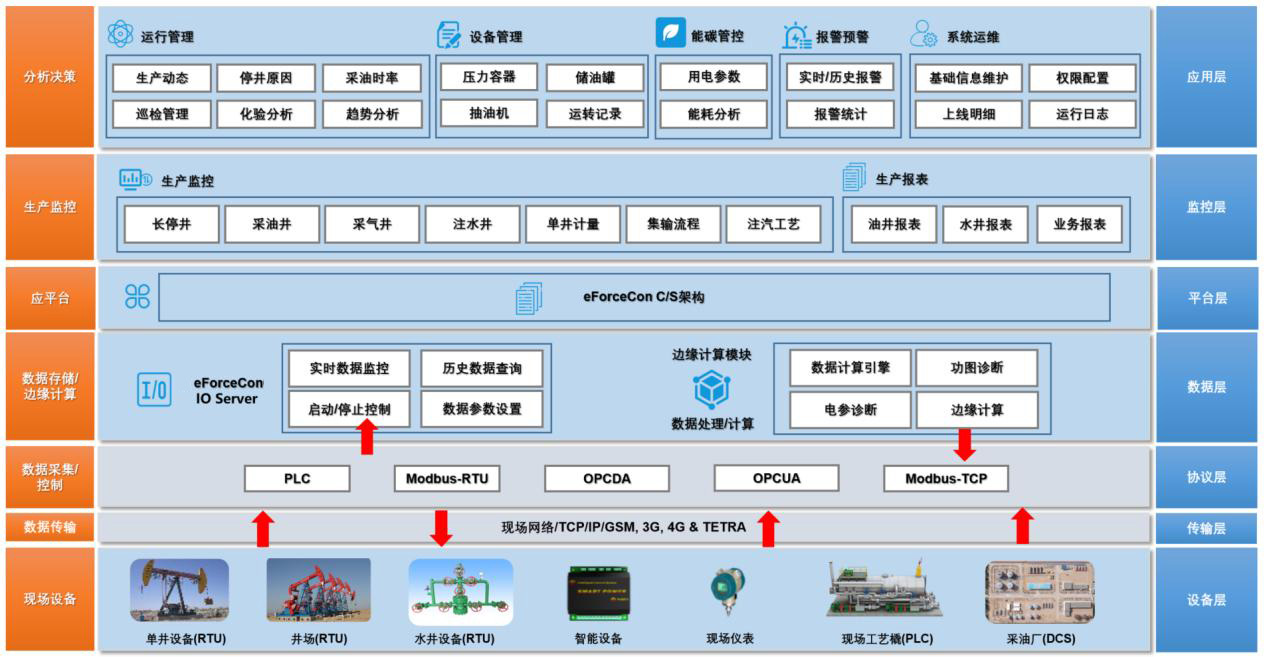 **设备层:**现场运行的单井设备、井场、水井设备、RTU、仪表、工艺设备等。