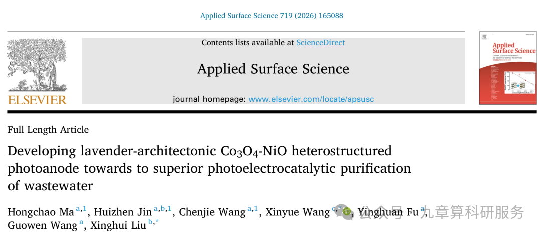 综上所述,我们通过两步水热法成功在钛基底上制备了Co3O4-NiO核壳结构。**通过精准调控前驱液浓度,实现了Co3O4与NiO****的优化复合,构筑出层次分明的核壳纳米架构。**该结构能充分暴露催化活性位点,并促进电荷高效传输,最终使光电催化降解效率达到94.33%的优异水平。材料在连续五次循环使用后,仍保持80.18%的活性。结果表明,Co3O4与NiO之间形成的Z 型异质结,有效促进了光生载流子的分离,从而合理解释了超氧自由基(·O2-)与空穴(h+)等活性物种的产生机制。该研究不仅证实了镍基纳米材料在光电催化领域的应用潜力,也为开发高效、稳定的催化体系提供了新思路,为后续面向实际水处理过程的光电催化剂设计与系统优化,奠定了扎实基础。