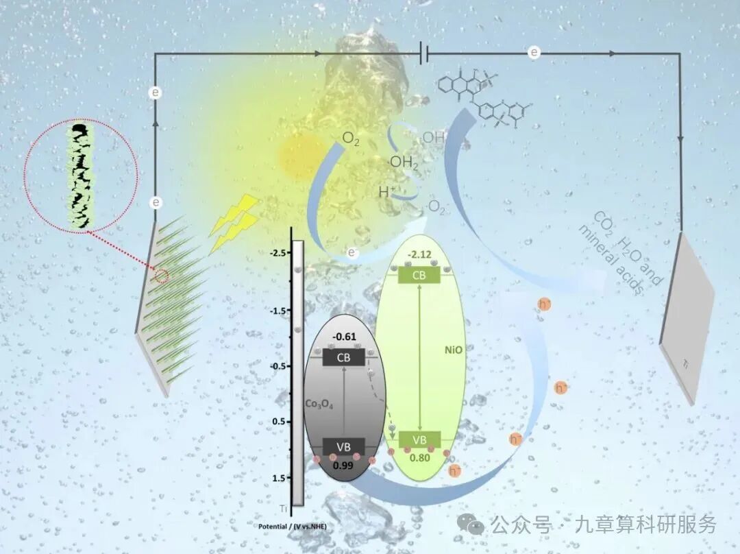流程图2以示意图的形式,清晰阐明了Co3O4-NiO异质结在光电催化过程中的内在反应机理。该图表明,在光照和外加电场共同作用下,Co3O4与NiO之间成功构建了Z 型异质结。在光激发和内建电场的共同驱动下,Co3O4导带上的光生电子与NiO价带上的光生空穴发生复合,从而实现载流子的空间分离。富集在NiO导带上的电子与溶液中的氧气反应生成超氧自由基(·O2**-),而富集在Co3O4价带上的强氧化性空穴则可通过生成****·OH攻击并降解染料分子****,可有效将染料分子降解为CO2和H2****O。**这张机理图将抽象的能带理论与直观的催化过程融为一体,完整地揭示了Co3O4-NiO材料实现高效污水净化的微观动态过程。