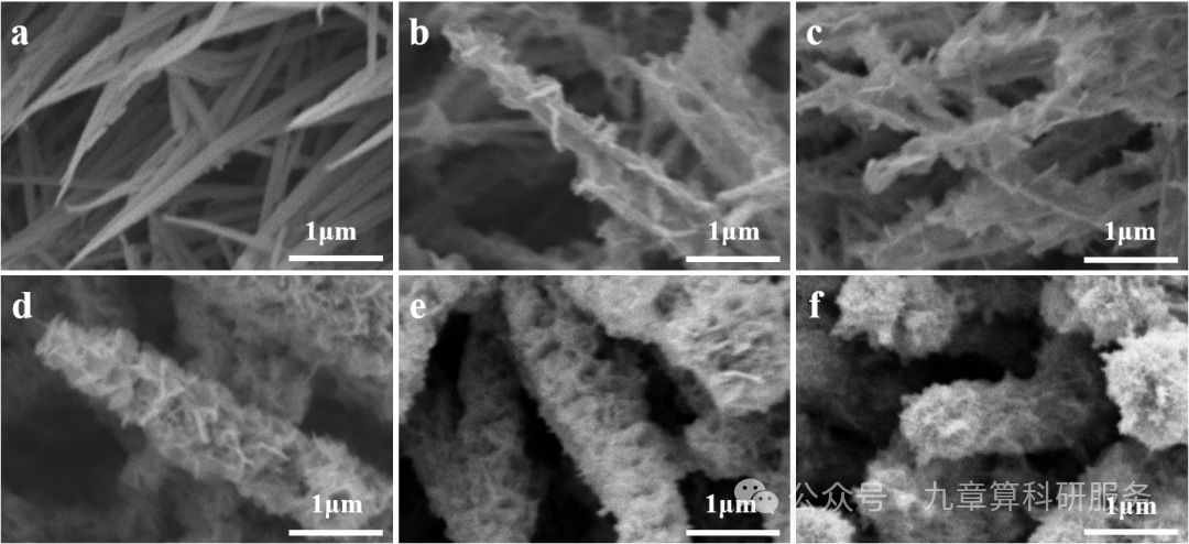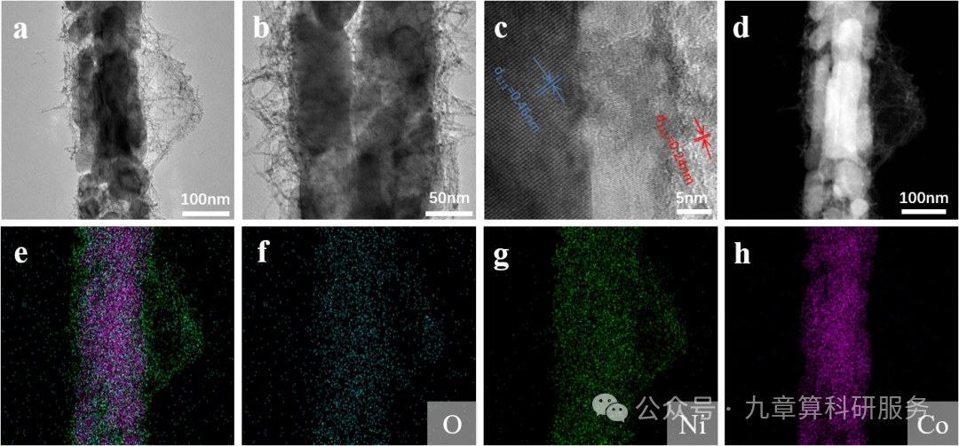 图1的SEM图像清晰展示了从纯Co3O4纳米线阵列到"薰衣草状"核壳异质结的形貌演变过程。随着镍源浓度增加,NiO纳米片逐步在Co3O4纳米线骨架上生长,在30 mM时形成均匀致密的理想核壳结构(图1d),有效增大比表面与活性位点;而浓度过高则导致纳米片堆叠过密(图1e-f),反使活性表面减少。进一步通过TEM分析(图2a-c),可见Co3O4纳米线被NiO纳米片完整包裹,高分辨图像中同时观察到Co3O4 (111) 晶面(0.46 nm)与NiO (111) 晶面(0.24 nm),证实两相紧密复合。STEM-EDS元素分布结果(图2d-h)进一步显示Co元素信号集中在内部区域,而Ni元素信号则完整地覆盖在Co信号外部,二者在空间上完美分离;与此同时,O元素的信号在整个结构中都均匀分布。最终证实了材料是由Co3O4为核、NiO为壳所构成的异质结结构。