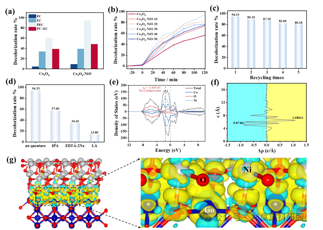 图5通过多组实验与理论计算,全面展示了Co3O4-NiO-30异质结的综合降解性能、稳定性及其内在机理。降解实验(图5a-b)表明,该电极在光电催化(PEC)模式下对活性艳蓝KN-R的降解率高达94.33%,其性能远超单一的光催化或电化学过程,并显著优于其他比例的样品,展现出显著的光电协同效应。循环稳定性测试(图5c)显示,该材料在连续使用5次后仍能保持80.18%的降解率,证明了其优异的可重复使用性。通过自由基捕获实验(图5d),研究确认了空穴(h+)、超氧自由基(·O2-)和羟基自由基(·OH)是降解过程中的三种关键活性物质。为了从原子尺度深入理解其高性能根源,研究团队进行了密度泛函理论(DFT)计算。态密度图(图5e)显示Ni是主要的催化活性中心,而电荷密度差分图(图5f-g)则直观揭示了界面处的电荷重新分布:电子从Co3O4侧流向NiO侧,这一现象符合典型的 Z****型异质结电荷分离机制,为上述优异的实验性能提供了坚实的理论支撑。