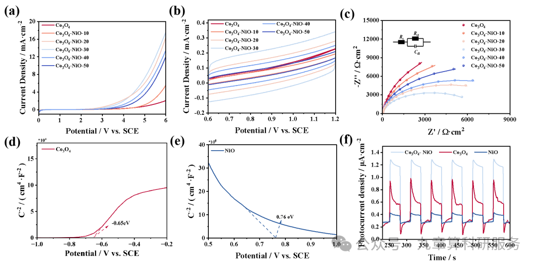图4通过一系列系统的电化学测试,全面评估了Co3O4-NiO异质结作为光阳极的卓越性能。线性伏安扫描曲线(图4a)显示,Co3O4-NiO-30电极具有最正的析氧电位,表明其拥有最优异的催化活性并能有效抑制副反应。循环伏安曲线(图4b)表明,该复合电极具有更大的电化学活性面积,为反应提供了更多的活性位点。最能说明问题的是电化学阻抗谱(图4c),Co3O4-NiO-30电极呈现出最小的阻抗弧半径,证明其界面电荷转移阻力最小,电子传输最为顺畅。莫特-肖特基测试(图4d-e)则从能带结构角度揭示了性能提升的根源:Co3O4表现为n型半导体,而NiO表现为p型半导体,二者成功构建了p-n异质结。最终,瞬态光电流响应测试(图4f)为上述所有优势提供了最直接的证据------Co3O4-NiO-30电极产生了最强且最稳定的光电流,充分证明了其高效的光生电荷分离与传输能力。这些数据共同表明,Co3O4**-NiO-30****通过构建理想的异质结结构,实现了电荷分离效率与传输动力学的双重提升,从而展现出最优的电化学性能。**