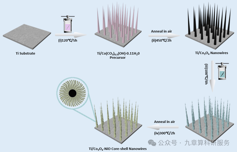 . 在钛片上合成缠绕核壳异质结Co3O4-NiO电极材料的制备流程图
