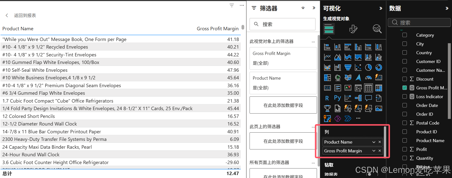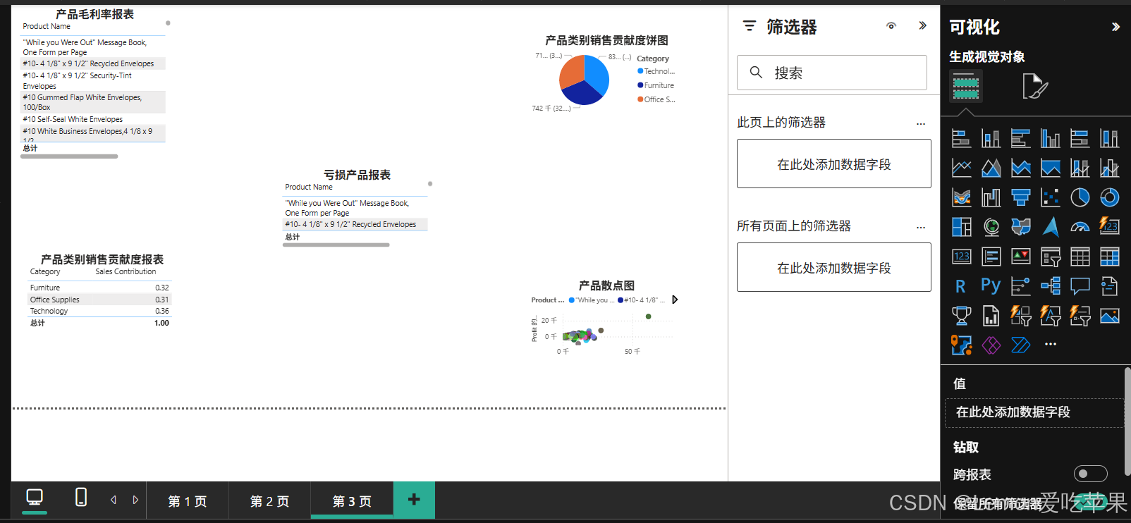 在这篇博客,你将收获产品毛利率报表 、产品类别销售贡献度报表 、亏损产品报表(条件格式标红) 、产品类别销售贡献度饼图 、产品散点图
