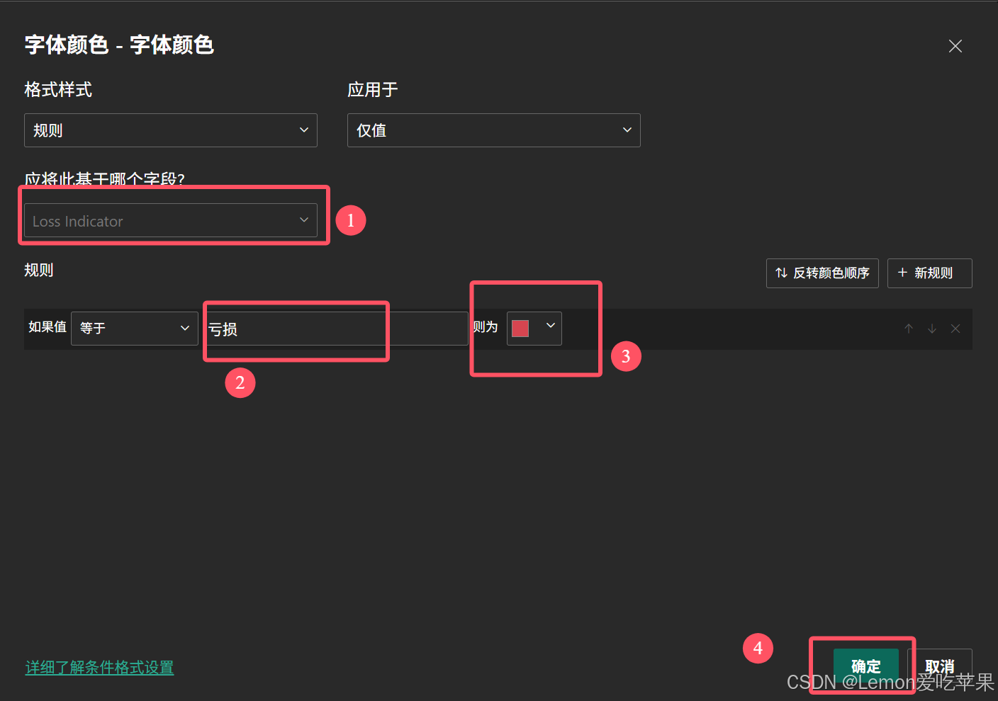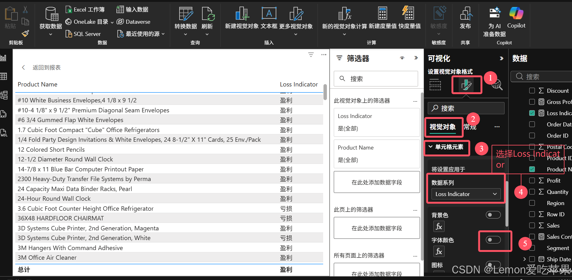 在视觉对象部分,找到单元格元素,选中 Loss Indicator ,找到字体颜色,进行条件选择,进行修改。