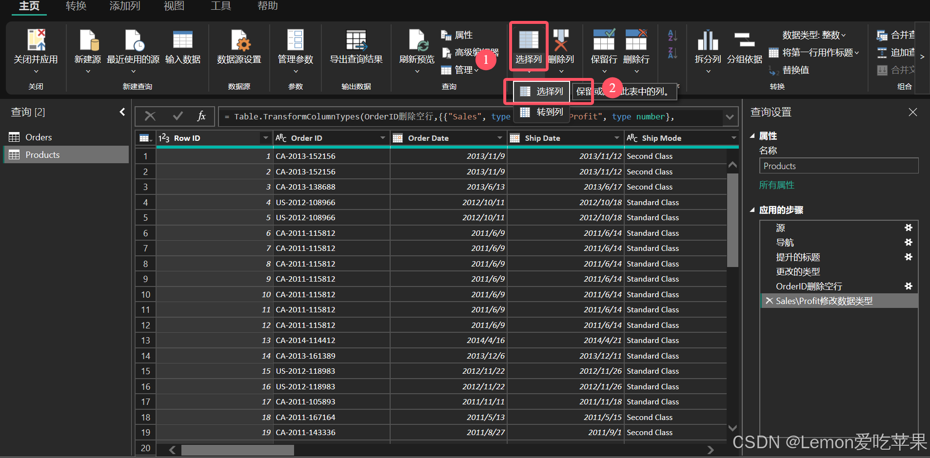 接着我们重命名为 Products 表,选中菜单栏的主页,找到选择列,点击选择列
