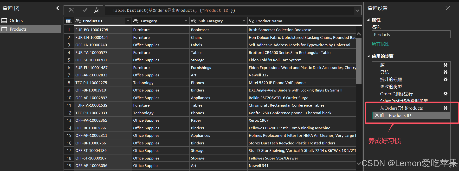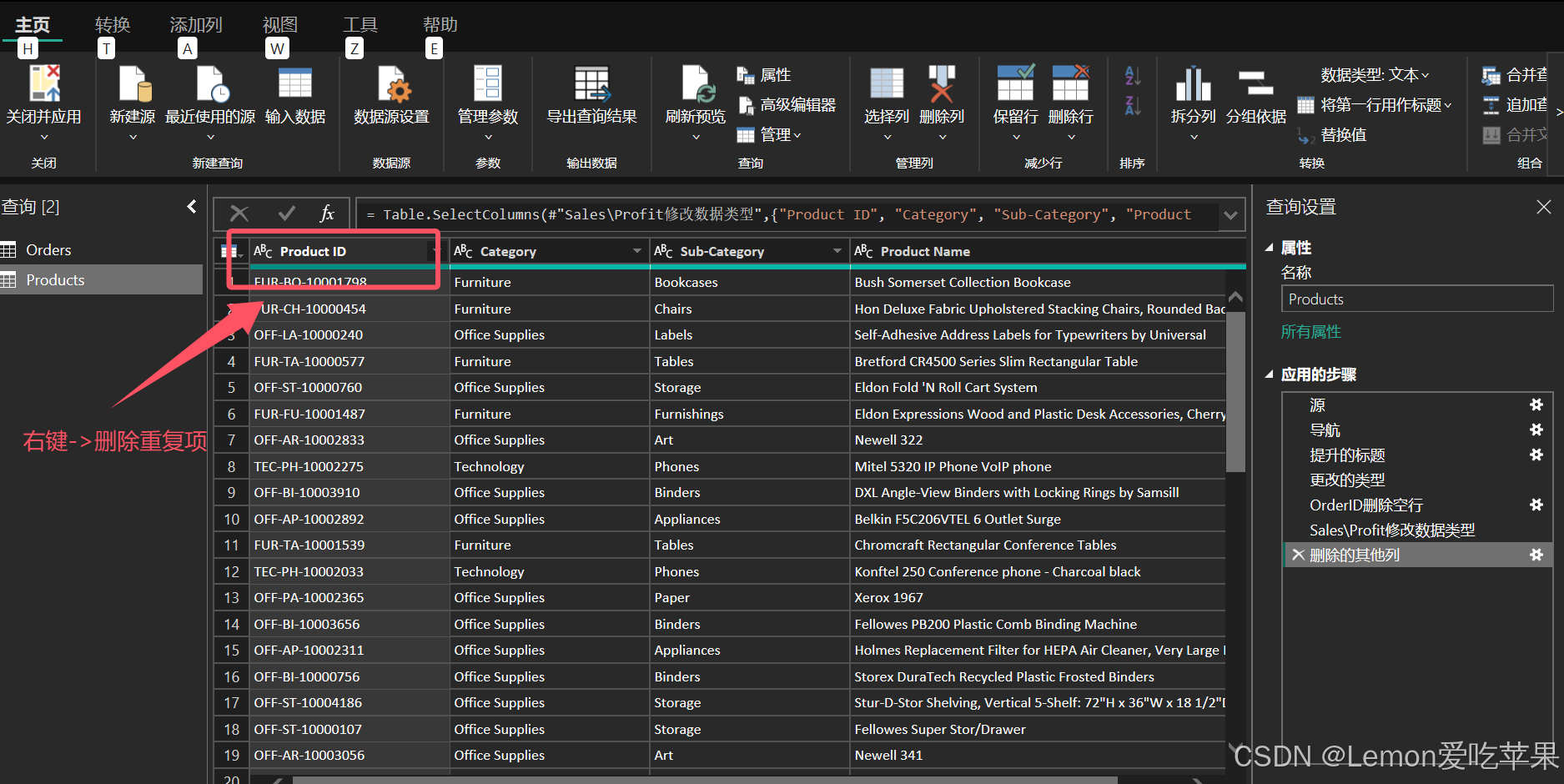 右键 Product ID 列 → 删除重复项,确保 Product ID 是唯一的,主键存在,避免数据冗余,同时唯一标识。