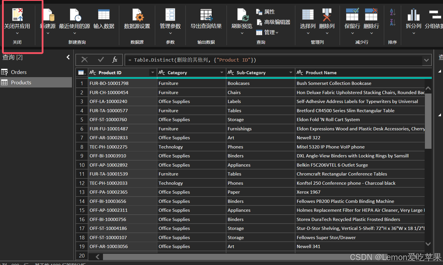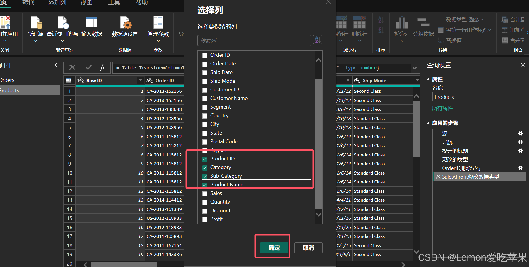 我们从 Orders 表中选择 Product ID、Category、Sub Category、ProductName 这四列,点击确定。