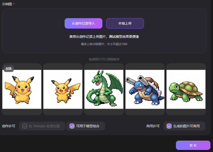 做下填空,然后 示例图 直接选 "从创作记录导入",选几张还凑合的,点击发布,然后别人就能搜到你的模型了: