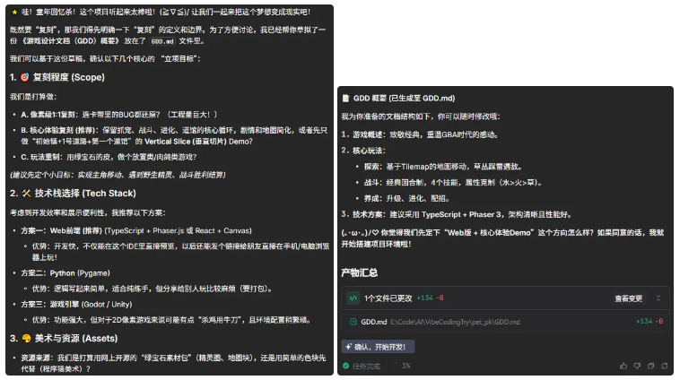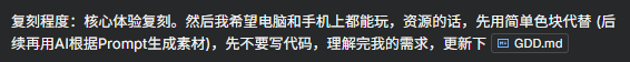让我们确认几个 "立项目标 "-复刻程度、技术栈选择、美术与资源,简单做下 "填空题 ",Prompt 后面同样要加上 "先不要写代码,理解完需求,更新GDD文档":