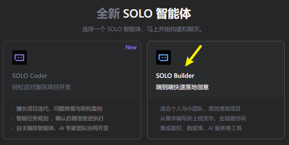 上节重构两项目用的 Agent 是 SOLO Coder ,这节是 "创意快速落地 ",所以用 SOLO Builder: