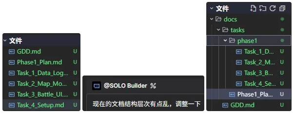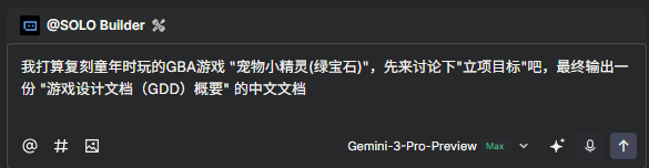 SOLO Builder 模式没有 Plan 开关,需要在 Prompt 中写明生成 GDD 文档,不然它有时会直接开始 "堆代码":